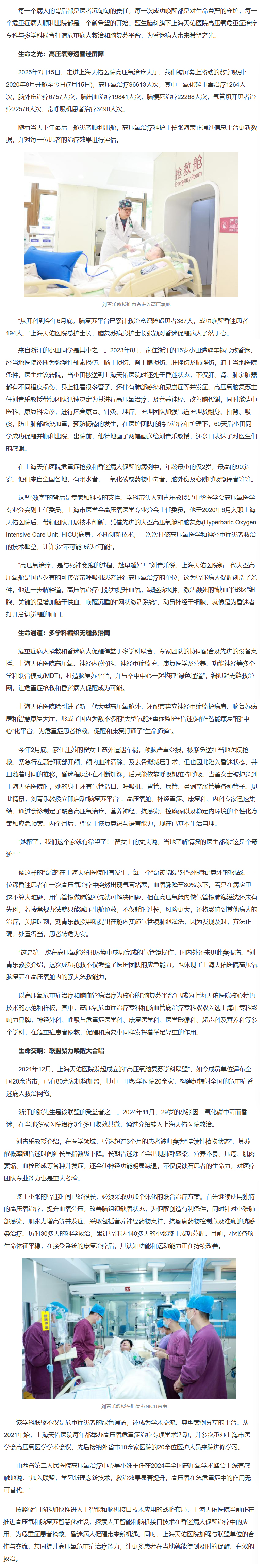 每一個病人的背后都是醫(yī)者沉甸甸的責(zé)任,每一次成功喚醒都是對生命尊嚴(yán)的守護(hù),每一個危重癥病人順利出院都是一個新希望的開始。藍(lán)生腦科旗下上海天佑醫(yī)院高壓氧危重癥治療專科與多學(xué)科聯(lián)合打造危重病人救治和腦復(fù)蘇平臺,為昏迷病人帶來希望之光。