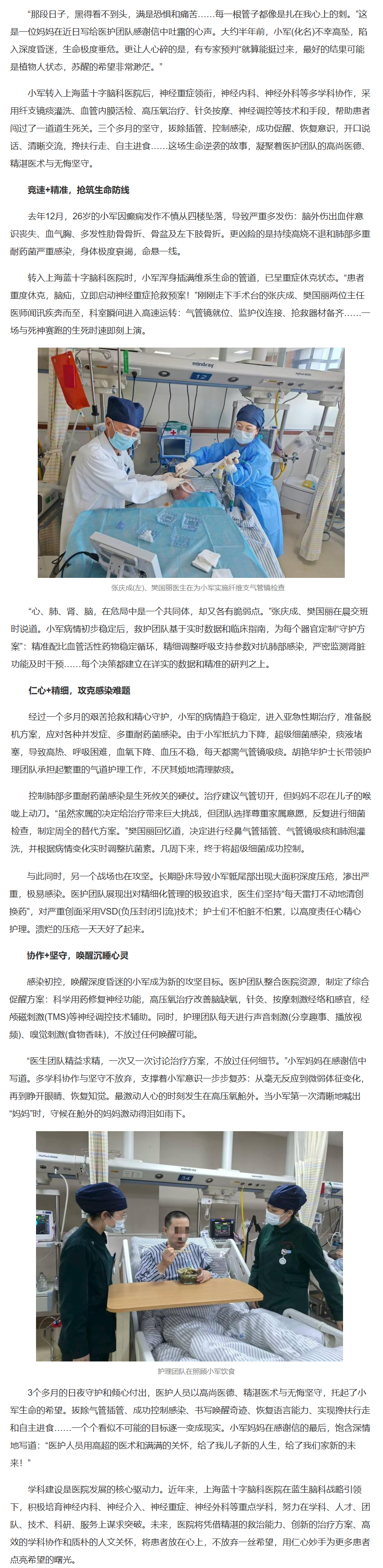“那段日子,黑得看不到頭,滿是恐懼和痛苦……每一根管子都像是扎在我心上的刺。”這是一位媽媽在近日寫給醫護團隊感謝信中吐露的心聲。大約半年前,小軍(化名)不幸高墜,陷入深度昏迷,生命極度垂危。更讓人心碎的是,有專家預判“就算能挺過來,最好的結果可能是植物人狀態,蘇醒的希望非常渺茫。”
