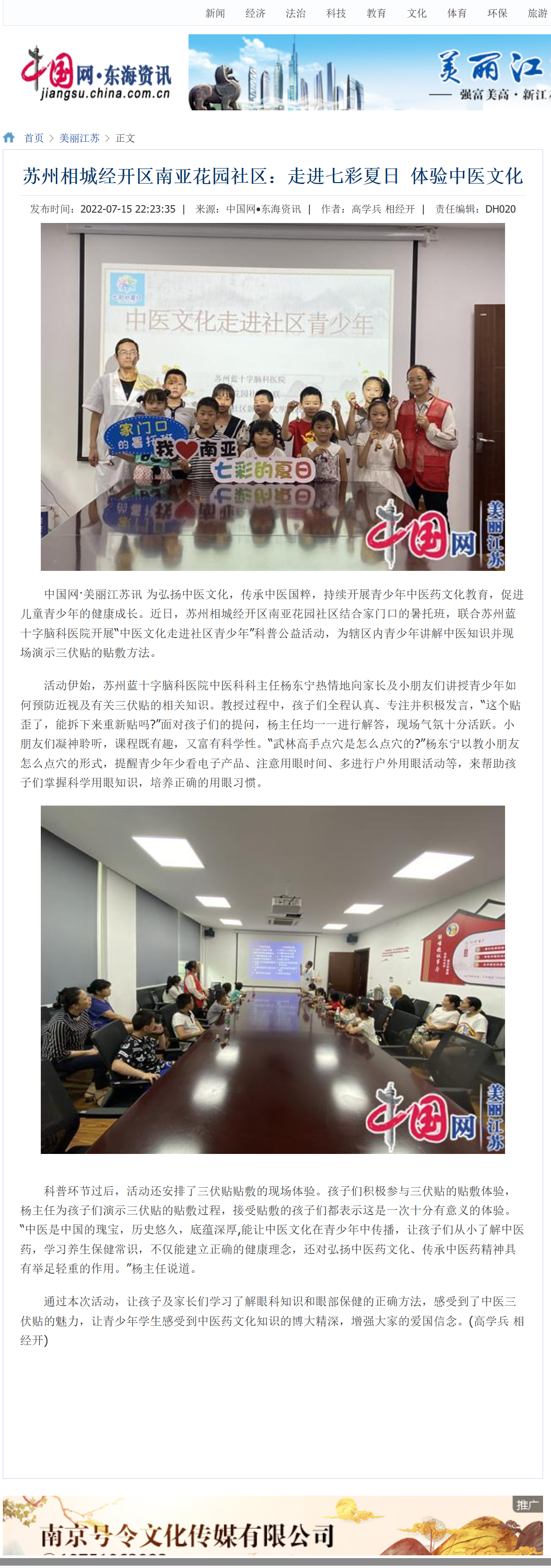 中國網·美麗江蘇訊 為弘揚中醫文化,傳承中醫國粹,持續開展青少年中醫藥文化教育,促進兒童青少年的健康成長。近日,蘇州相城經開區南亞花園社區結合家門口的暑托班,聯合蘇州藍十字腦科醫院開展“中醫文化走進社區青少年”科普公益活動,為轄區內青少年講解中醫知識并現場演示三伏貼的貼敷方法。