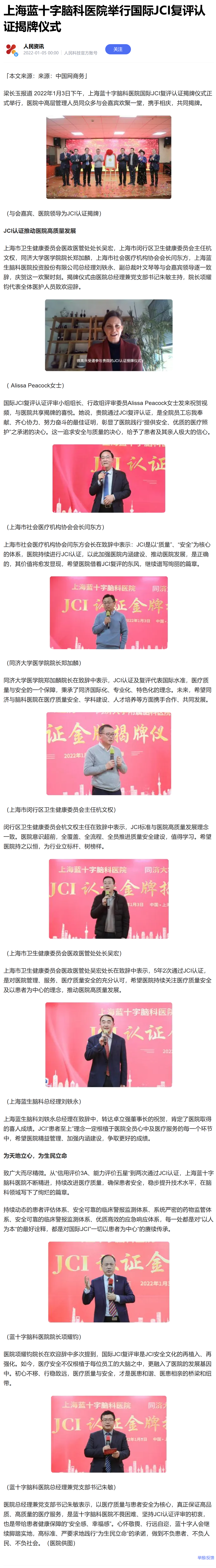 人民資訊:上海藍十字腦科醫院舉行國際JCI復評認證揭牌儀式