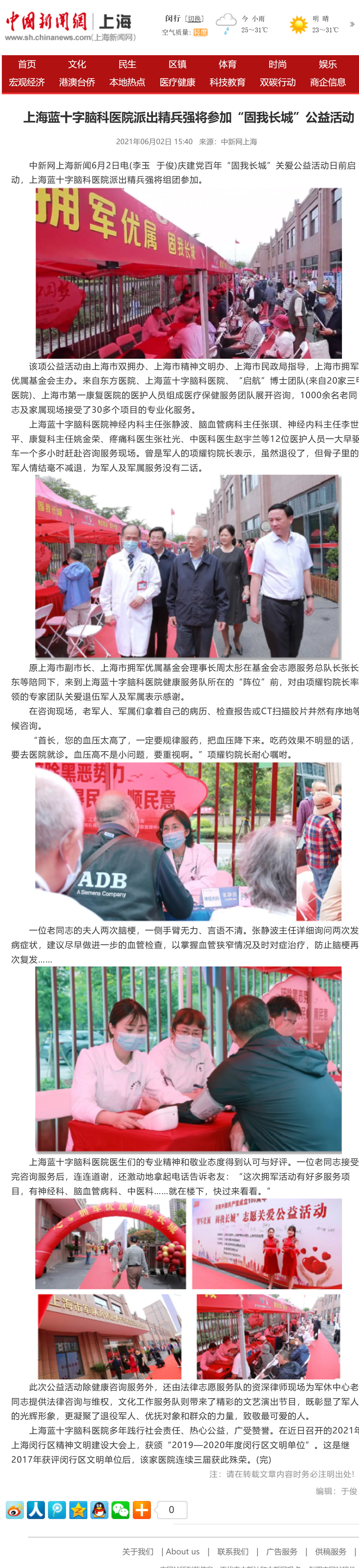 中新網上海新聞6月2日電(李玉 于俊)慶建黨百年“固我長城”關愛公益活動日前啟動,上海藍十字腦科醫院派出精兵強將組團參加。