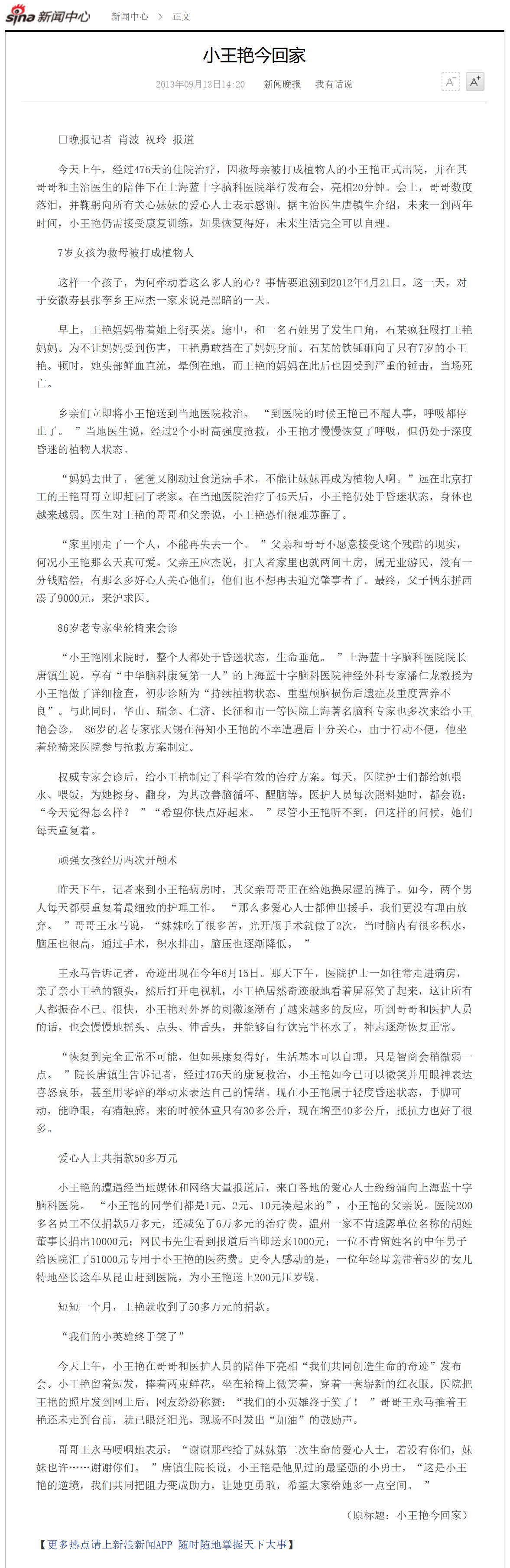 今天上午,經過476天的住院治療,因救母親被打成植物人的小王艷正式出院,并在其哥哥和主治醫生的陪伴下在上海藍十字腦科醫院舉行發布會,亮相20分鐘。會上,哥哥數度落淚,并鞠躬向所有關心妹妹的愛心人士表示感謝。據主治醫生唐鎮生介紹,未來一到兩年時間,小王艷仍需接受康復訓練,如果恢復得好,未來生活完全可以自理。