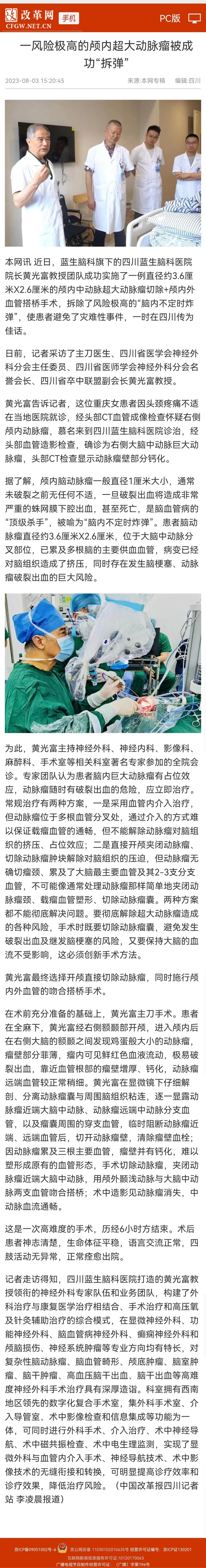 本網訊 近日,藍生腦科旗下的四川藍生腦科醫院院長黃光富教授團隊成功實施了一例直徑約3.6厘米X2.6厘米的顱內中動脈超大動脈瘤切除+顱內外血管搭橋手術,拆除了風險極高的“腦內不定時炸彈”,使患者避免了災難性事件,一時在四川傳為佳話。