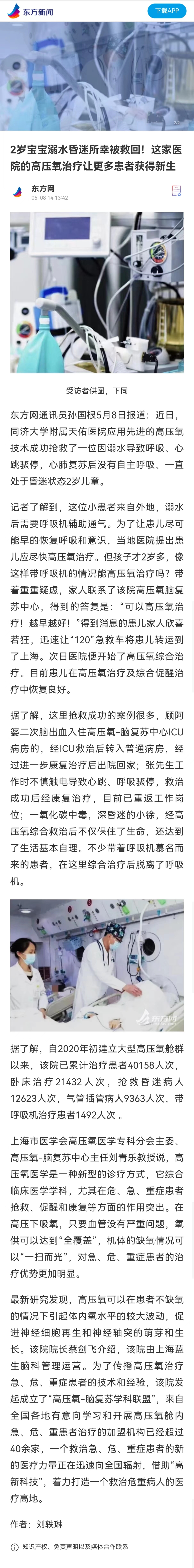 東方網:2歲寶寶溺水昏迷所幸被救回!這家醫院的高壓氧治療讓更多患者獲得新生