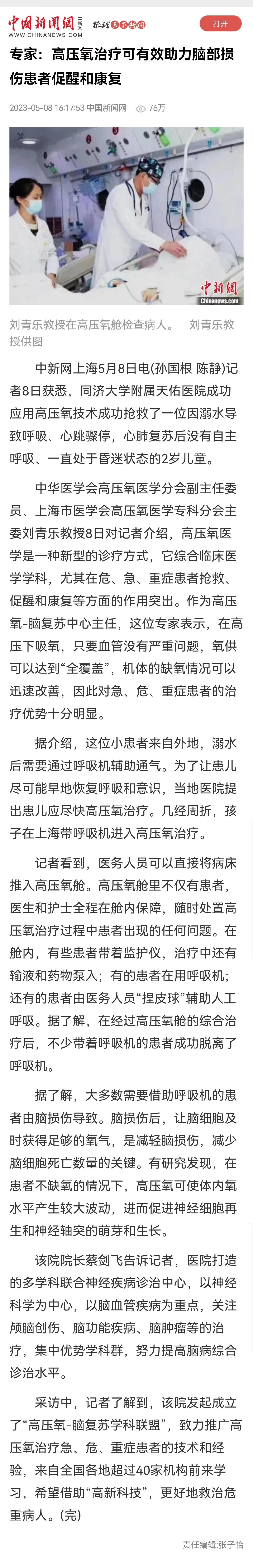 中新網(wǎng)上海5月8日電(孫國根 陳靜)記者8日獲悉,同濟大學(xué)附屬天佑醫(yī)院成功應(yīng)用高壓氧技術(shù)成功搶救了一位因溺水導(dǎo)致呼吸、心跳驟停,心肺復(fù)蘇后沒有自主呼吸、一直處于昏迷狀態(tài)的2歲兒童。