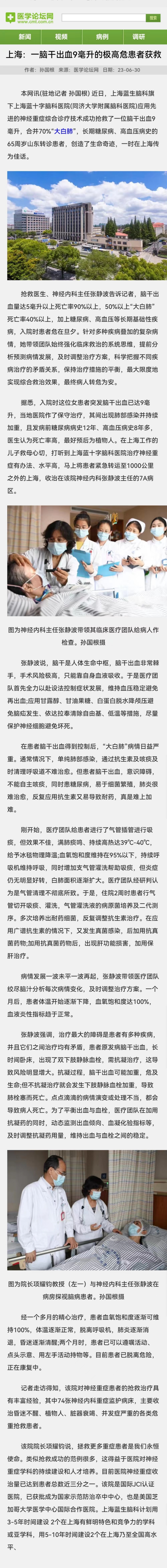 本網訊(駐地記者 孫國根) 近日,上海藍生腦科旗下上海藍十字腦科醫院(同濟大學附屬腦科醫院)應用先進的神經重癥綜合診療技術成功搶救了一位腦干出血9毫升,合并70%大白肺,長期糖尿病、高血壓病史的65周歲山東轉診患者,創造了生命奇跡,一時在上海傳為佳話。 搶救醫生、神經內科主任張靜波告訴記者,腦干出血量達5毫升以上死亡率90%以上,50%以上大白肺死亡率40%以上,加上糖尿病、高血壓等長期基礎性。