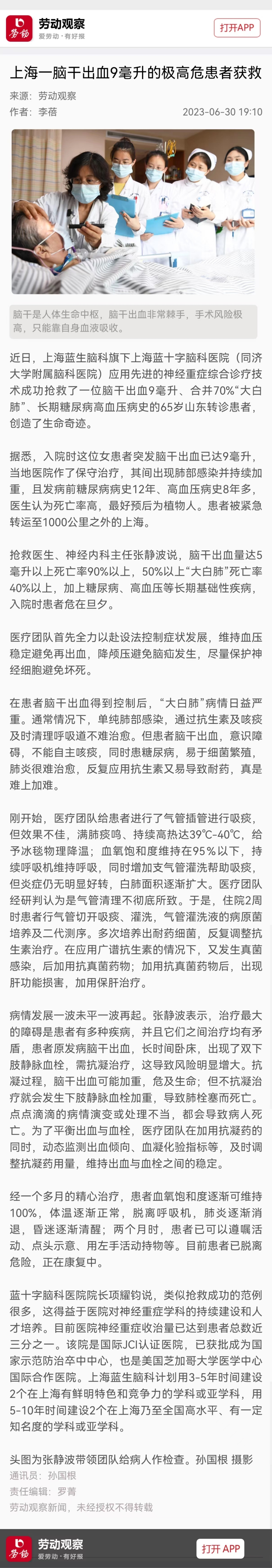 近日,上海藍生腦科旗下上海藍十字腦科醫(yī)院(同濟大學(xué)附屬腦科醫(yī)院)應(yīng)用先進的神經(jīng)重癥綜合診療技術(shù)成功搶救了一位腦干出血9毫升、合并70%“大白肺”、長期糖尿病高血壓病史的65歲山東轉(zhuǎn)診患者,創(chuàng)造了生命奇跡。