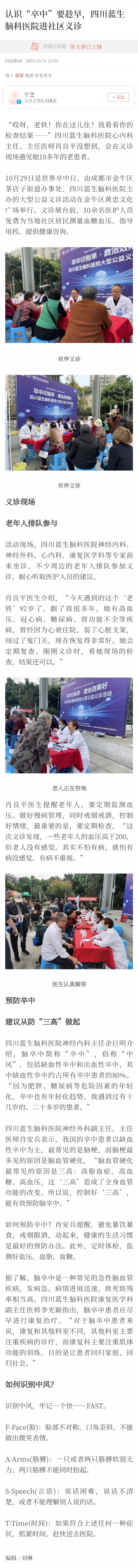 10月29日是世界卒中日,由成都市金牛區(qū)茶店子街道辦事處、四川藍(lán)生腦科醫(yī)院主辦的大型公益義診活動(dòng)在金牛區(qū)黃忠文化廣場(chǎng)舉行。義診展臺(tái)前,10余名醫(yī)護(hù)人員免費(fèi)為當(dāng)?shù)厣鐓^(qū)居民測(cè)量血糖血壓、指導(dǎo)用藥、提供健康咨詢。