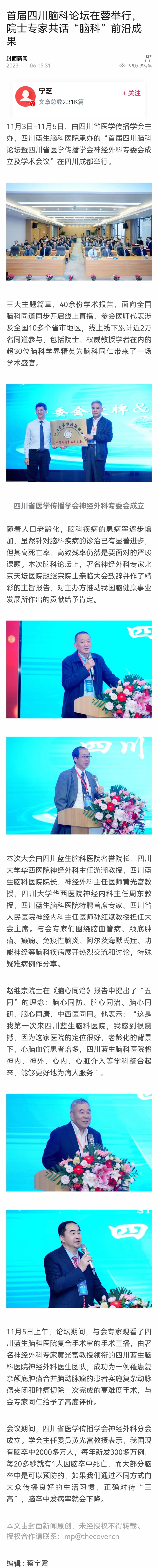 11月3日-11月5日,由四川省醫(yī)學(xué)傳播學(xué)會主辦,四川藍生腦科醫(yī)院承辦的“首屆四川腦科論壇暨四川省醫(yī)學(xué)傳播學(xué)會神經(jīng)外科專委會成立及學(xué)術(shù)會議”在四川成都舉行。