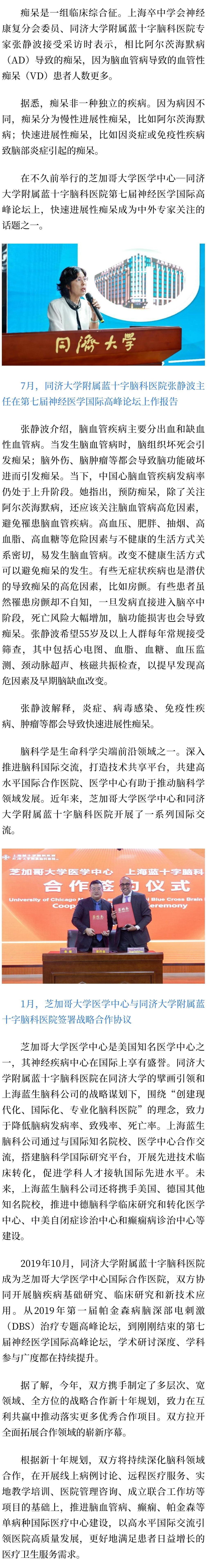 深入推進腦科國際交流,打造技術共享平臺,共建高水平國際合作醫(yī)院、醫(yī)學中心有助于推動腦科學領域發(fā)展。近年來,芝加哥大學醫(yī)學中心和同濟大學附屬藍十字腦科醫(yī)院開展了一系列國際交流。