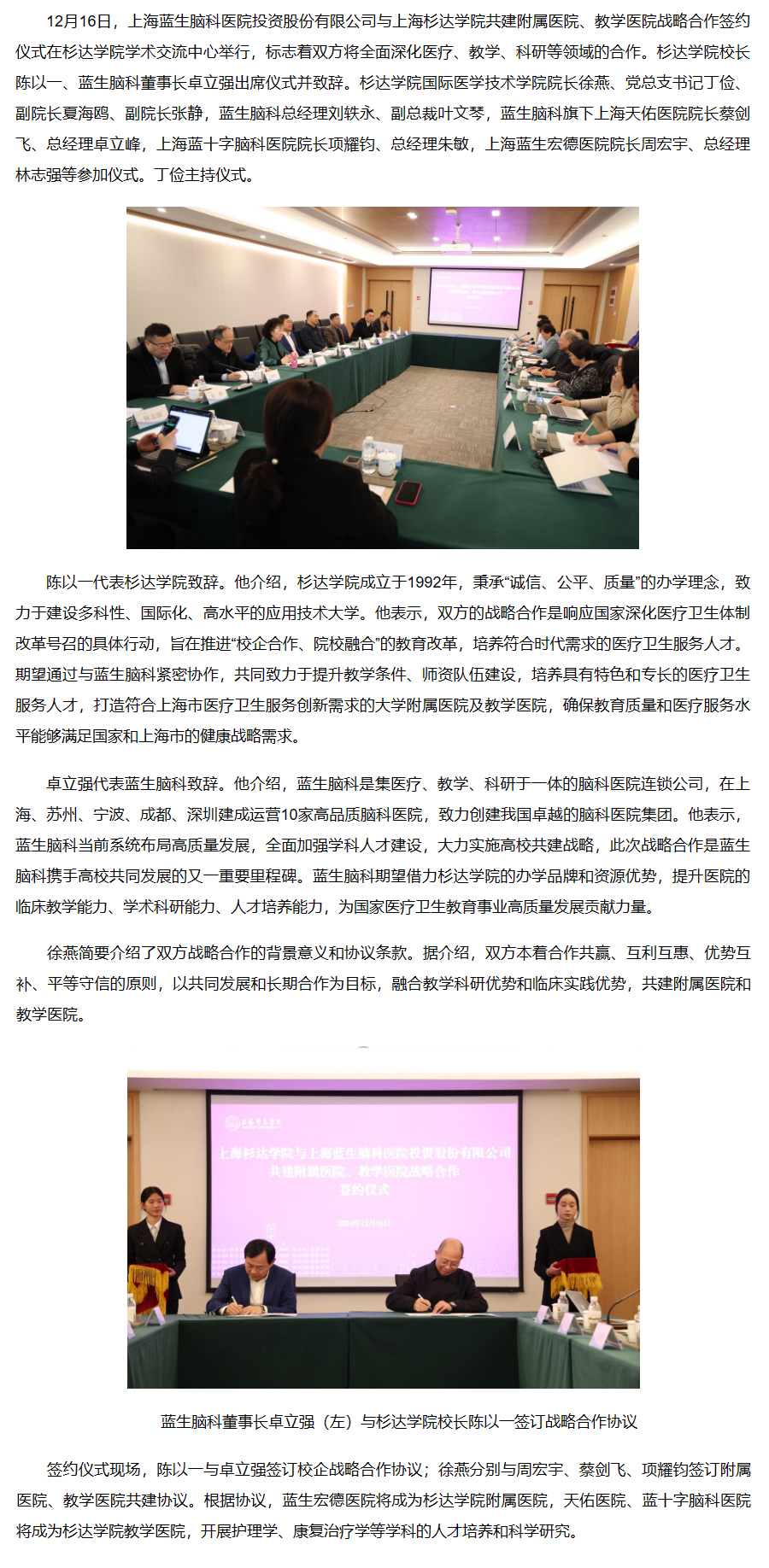 12月16日,上海藍生腦科醫院投資股份有限公司與上海杉達學院共建附屬醫院、教學醫院戰略合作簽約儀式在杉達學院學術交流中心舉行,標志著雙方將全面深化醫療、教學、科研等領域的合作。杉達學院校長陳以一、藍生腦科董事長卓立強出席儀式并致辭。
