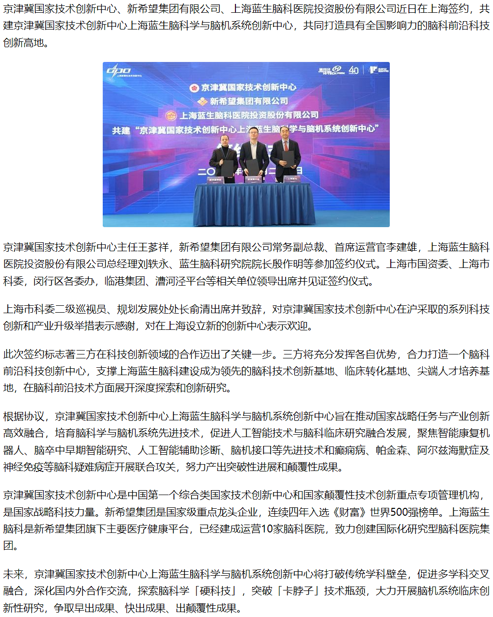 京津冀國家技術創新中心、新希望集團有限公司、上海藍生腦科醫院投資股份有限公司近日在上海簽約,共建京津冀國家技術創新中心上海藍生腦科學與腦機系統創新中心,共同打造具有全國影響力的腦科前沿科技創新高地。