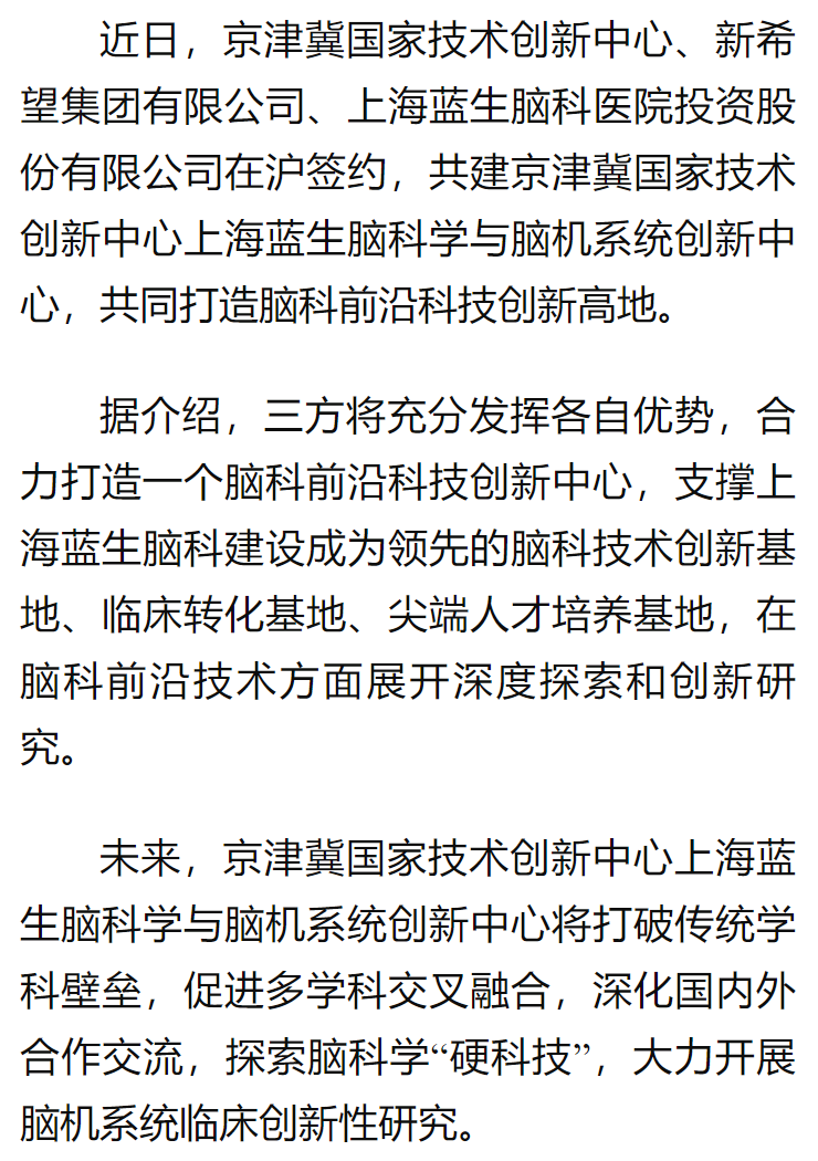 近日,京津冀國家技術創新中心、新希望集團有限公司、上海藍生腦科醫院投資股份有限公司在滬簽約,共建京津冀國家技術創新中心上海藍生腦科學與腦機系統創新中心,共同打造腦科前沿科技創新高地。