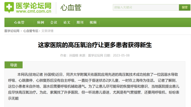 東方網:2歲寶寶溺水昏迷所幸被救回!這家醫院的高壓氧治療讓更多患者獲得新生