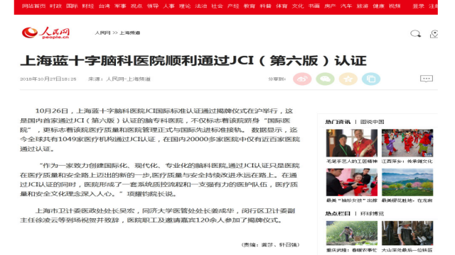 人民網上海頻道:上海藍十字腦科醫院順利通過JCI(第六版)認證