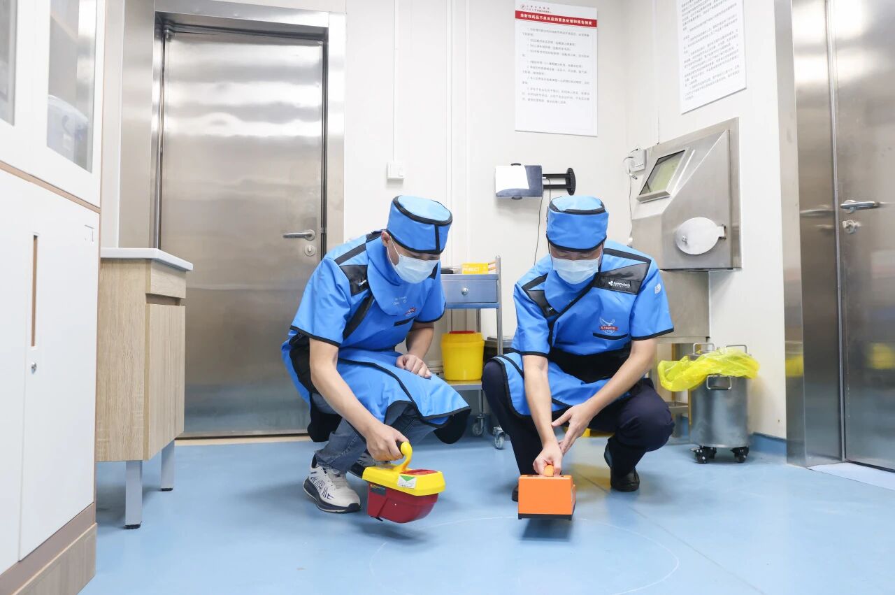 突發意外,非同小可。當事人立即啟動應急預案,一場演練也就此展開。陳波護師作為現場主要當事人,迅速穿戴防化服后用具有吸附性的紙巾和抹布對灑落的氟-18進行清理,并將沾有鍀-99的清理雜物放入指定放射性廢物儲存點,隨后迅速離開現場。