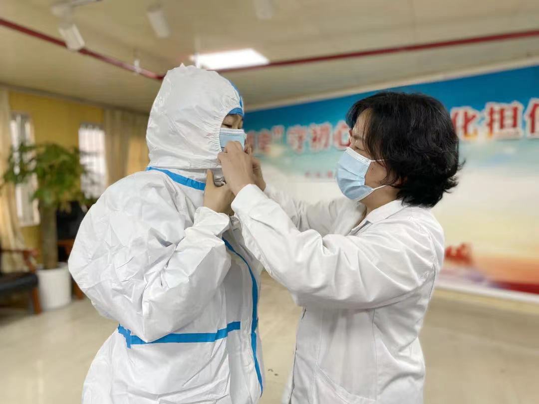 四病區護士長于如如現場指導示范穿戴防護服和消毒隔離的正確操作,通過結合視頻課件和實操培訓,隊員們逐一通過考核并完成采樣崗前防控培訓。