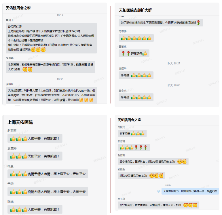 全院員工在了解到醫療隊快速奔赴一線后,紛紛通過微信留言,為戰友們加油鼓勁。很多員工表示隨時準備著,只要有需要,隨時出征,為普陀、為上海抗疫作出應有的貢獻。