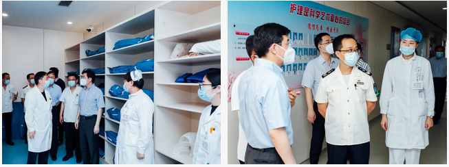 區衛健委領導一行先后到門急診、高壓氧艙、放療科、康復大廳、高壓氧-腦復蘇病房實地參觀。奉典旭主任一邊參觀,一邊關切地詢問病區床位規模、病人收治、學科人才、設備配置等情況,以及疫情期間醫院運行情況和復工復產情況。蔡劍飛院長一一做了介紹。奉主任強調,隨著上海醫療機構陸續恢復正常診療服務,要時刻繃緊疫情防控這根弦,統籌做好疫情防控和醫療服務工作。