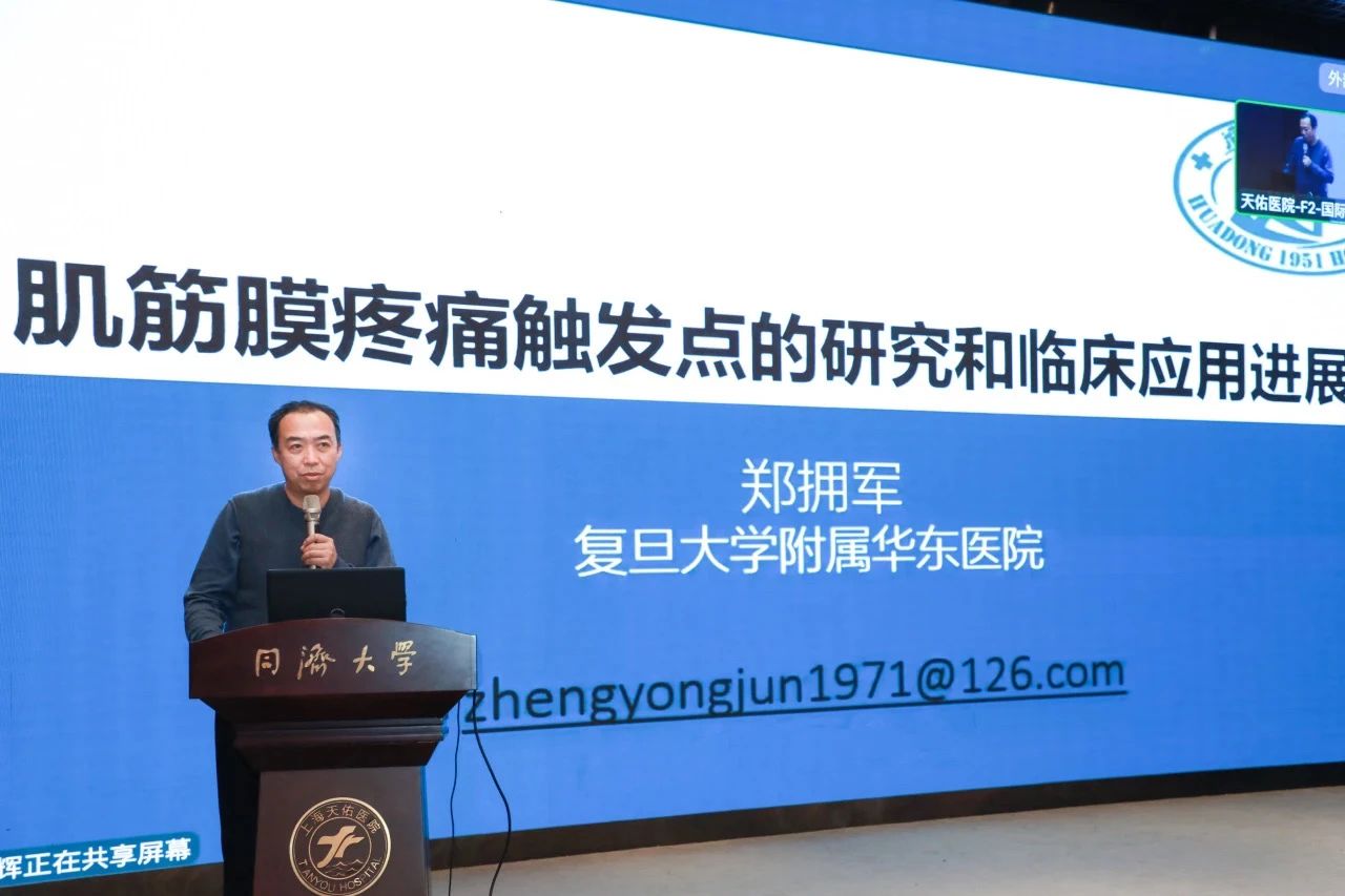 復旦大學附屬華東醫院康復科鄭擁軍主任作《肌筋膜疼痛觸發點的研究和臨床應用進展》主題分享。“肌筋膜觸發點是骨骼肌肌肉能夠激惹疼痛的某一特定位置,這個位置通常可以摸到一個疼痛結節和繃緊肌纖維痙攣帶,觸壓時有疼痛加重和局部肌肉顫搐以及可能引起的遠處牽涉痛;常有交感現象、易疲勞、睡眠障礙等一系列以疼痛為主的癥候群。”他介紹了肌筋膜觸發點的病理生理機制、引起肌筋膜觸發點的因素等,還分享了課題組在觸發點治療方面的研究進展、觸發點近年基礎和臨床研究進展。