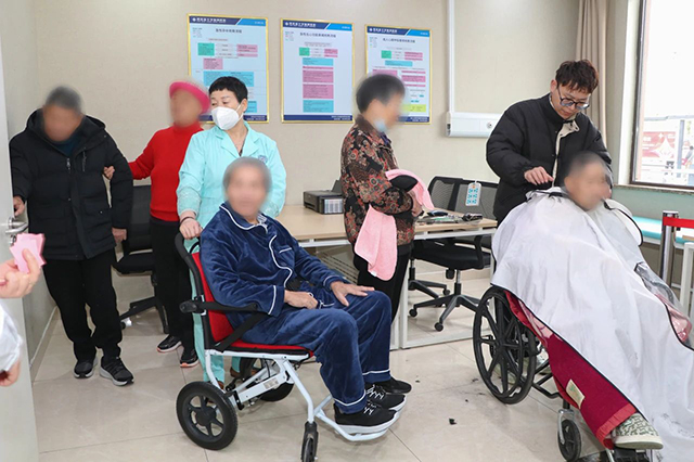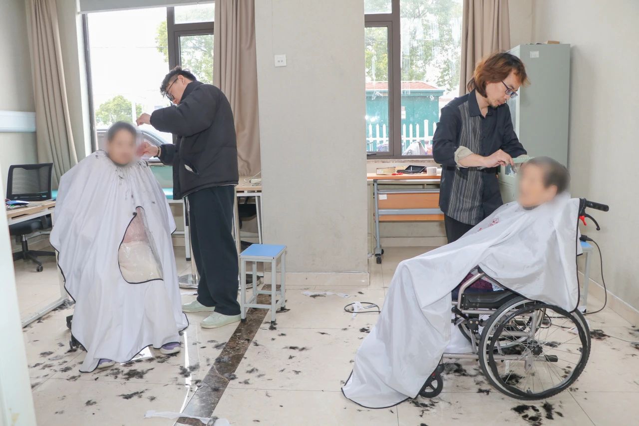 慈溪藍十字腦科醫(yī)院聯(lián)合地球村美發(fā)志愿團隊來到醫(yī)院,開展“愛心義剪”活動。志愿者們分成兩組,一組在臨時診室提供免費理發(fā)服務(wù),一組深入重癥康復(fù)病房開展床旁服務(wù)。短短一個上午,志愿者為 32 位人員完成理發(fā)。