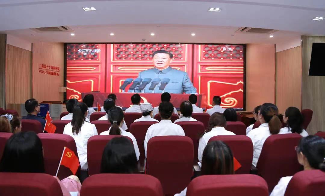 7月1日上午8時,慶祝中國共產黨成立100周大會在北京天安門廣場隆重舉行。中共中央總書記、國家主席、中央軍委主席習近平發表重要講話。上海藍十字腦科醫院黨支部書記兼總經理朱敏等院領導帶頭,黨支部成員及部分醫護代表在十樓多功能會議廳集中觀看大會實況直播,共同慶祝中國共產黨成立100周年。