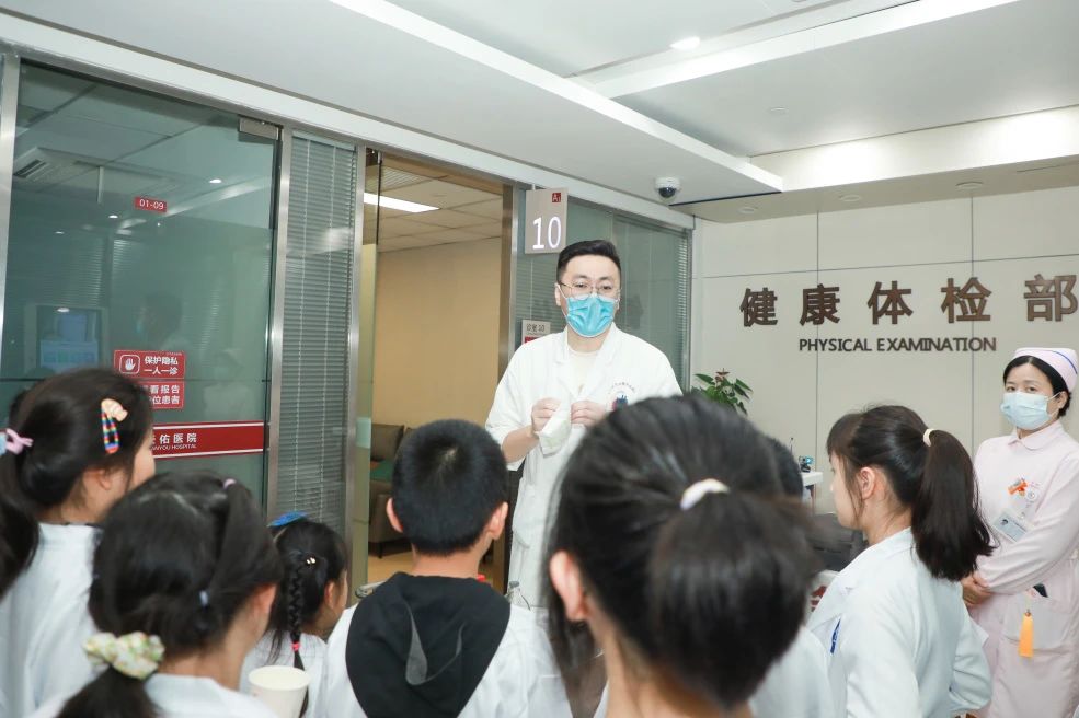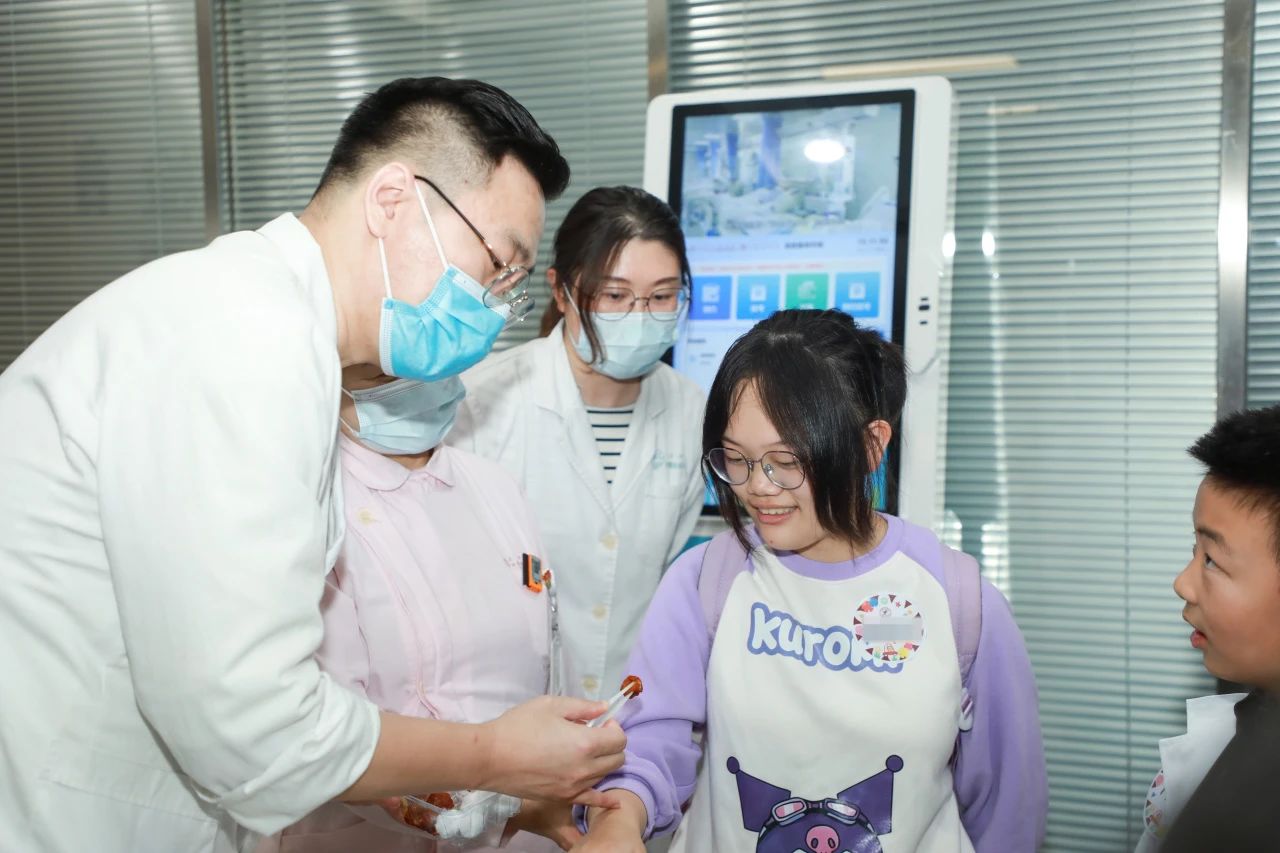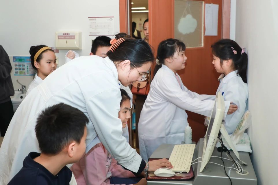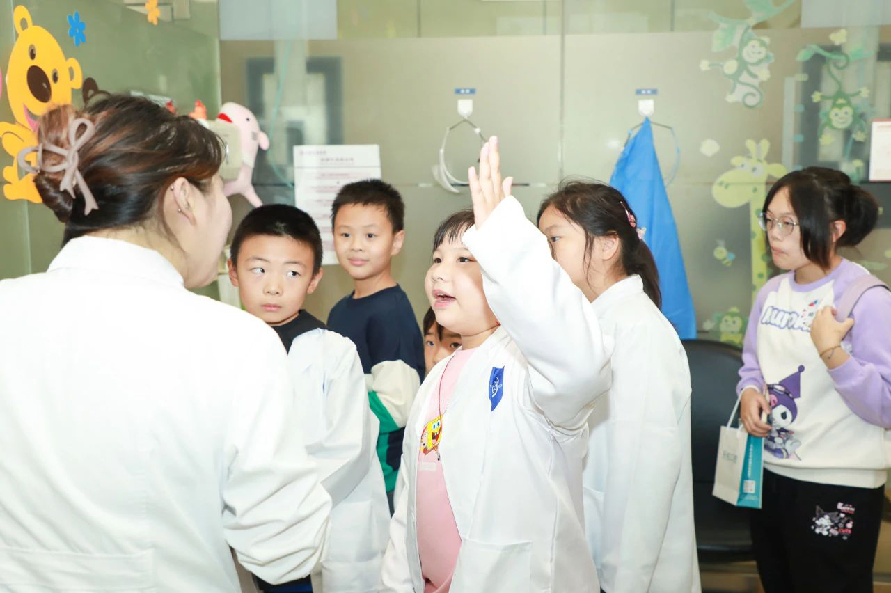 下午2:30,孩子們穿上了定制的白大褂,興奮地聚集在門診大廳,拍完了美美的合影,“小醫(yī)生”們就迫不及待地“上崗”了。